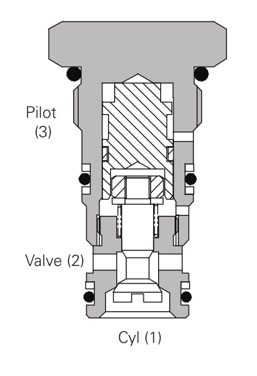 Pressure on the valve port causes the poppet to lift against the spring force, allowing the flow to the cylinder port. Reverse flow is prevented by the poppet reseating. Pressure applied to the pilot port will overcome the cylinder port pressure and lift the poppet from its seat, allowing flow from the cylinder to valve port.